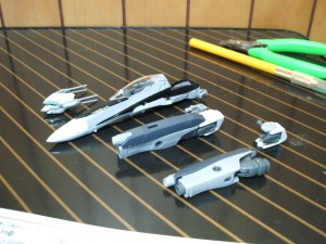 1.保持パーツとブースターを外し、肩のパーツと主翼とコックピット先端を上げる